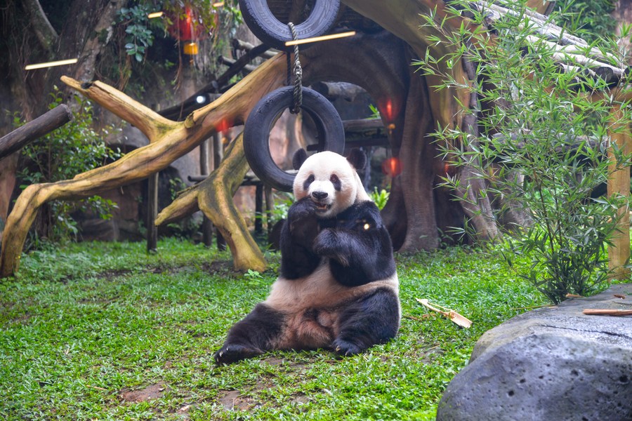 Giant panda "Cai Tao" is seen at Taman Safari Bogor of Indonesia, Jan. 21, 2022. (Xinhua/Xu Qin)