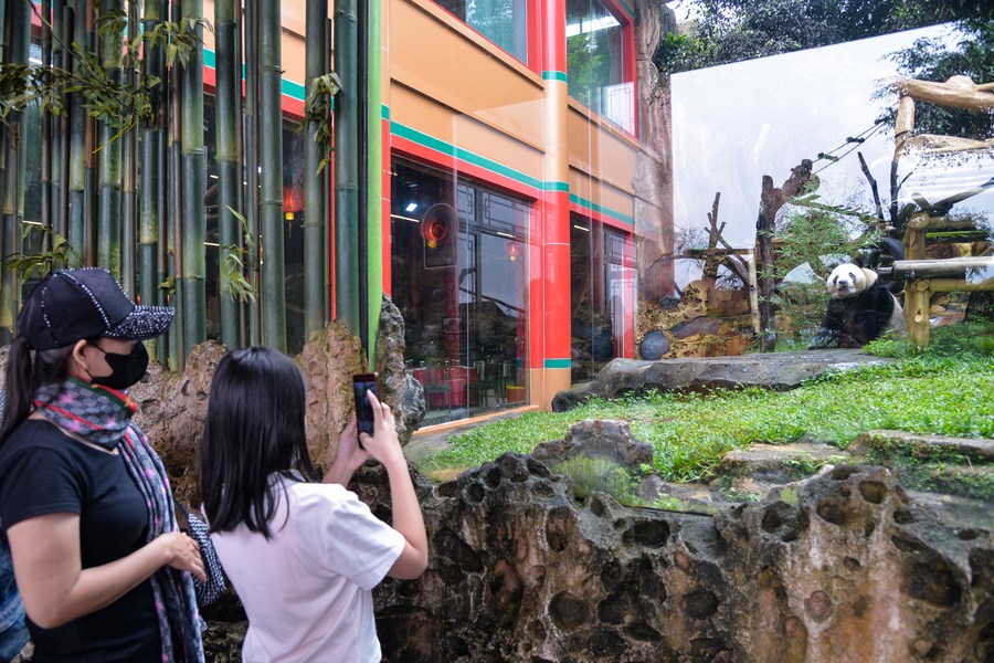 Visitors take photos of giant panda "Cai Tao" at Taman Safari Bogor of Indonesia, Jan. 21, 2022. (Xinhua/Xu Qin)