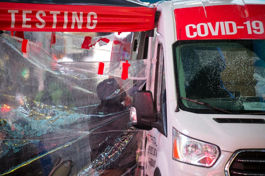 People walk past a COVID-19 testing site in Times Square in New York, the United States, Jan. 9, 2022. (Photo by Michael Nagle/Xinhua)