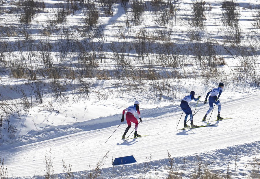 Skiers compete during the men's large hill individual Gundersen 10km of the FIS Continental Cup Nordic Combined in Chongli of Zhangjiakou City, north China's Hebei Province on Dec. 5, 2021. (Xinhua/Hu Huhu)