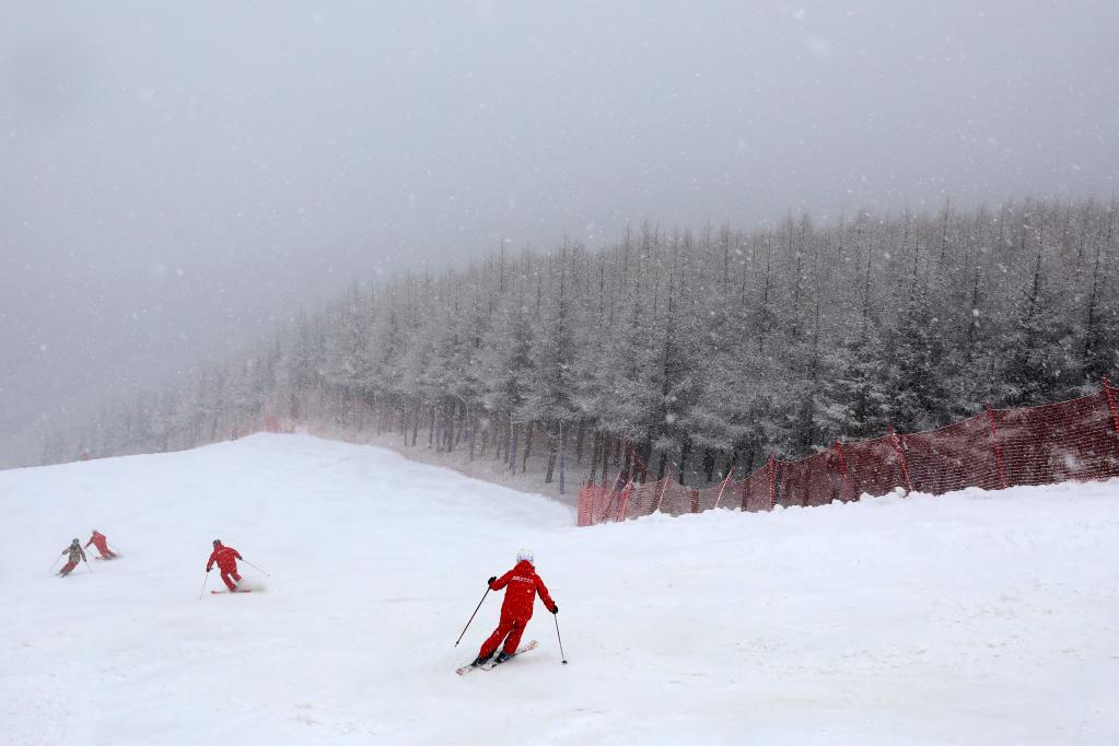 People ski at a ski field during a snowfall in Chongli District of Zhangjiakou City, north China's Hebei Province on Nov. 18, 2020. (Photo by Wu Diansen/Xinhua)