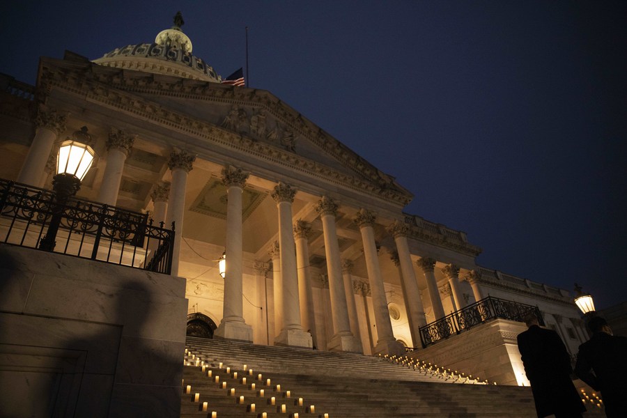 A U.S. national flag flies at half-staff and candles are lit at the U.S. Capitol Building to mark the anniversary of the Jan. 6 attack on the Capitol in Washington, D.C., the United States, Jan. 6, 2022. (Photo by Aaron Schwartz/Xinhua)