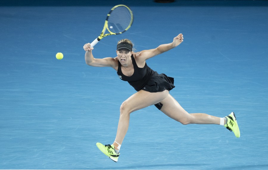 Danielle Collins of the United States competes in the women's singles semifinal match against Iga Swiatek of Poland at Australian Open in Melbourne, on Jan. 27, 2022. (Xinhua/Bai Xuefei)