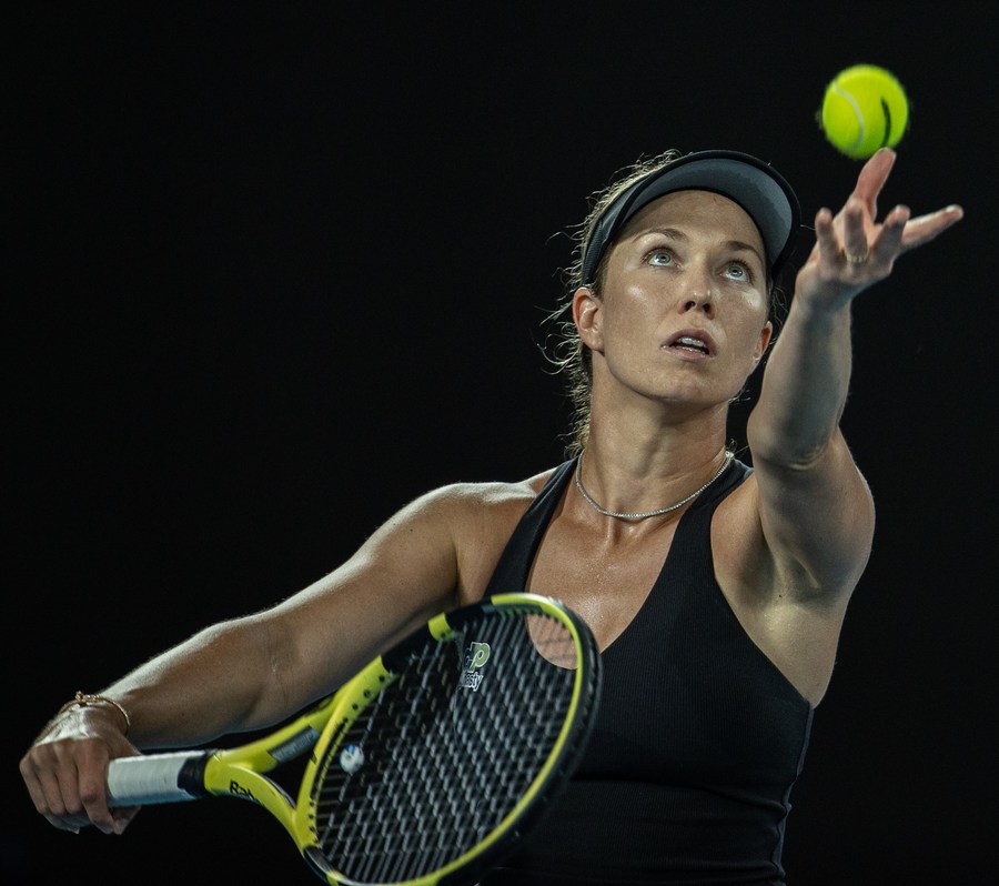 Danielle Collins of the United States serves her singles semifinal match against Iga Swiatek of Poland at Australian Open in Melbourne, on Jan. 27, 2022. (Photo by Hu Jingchen/Xinhua)