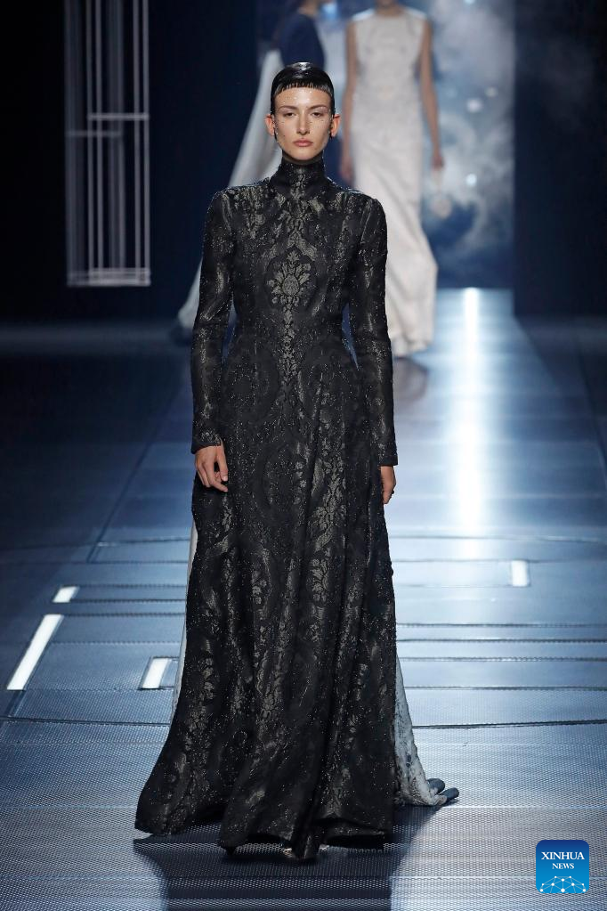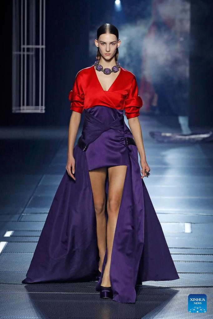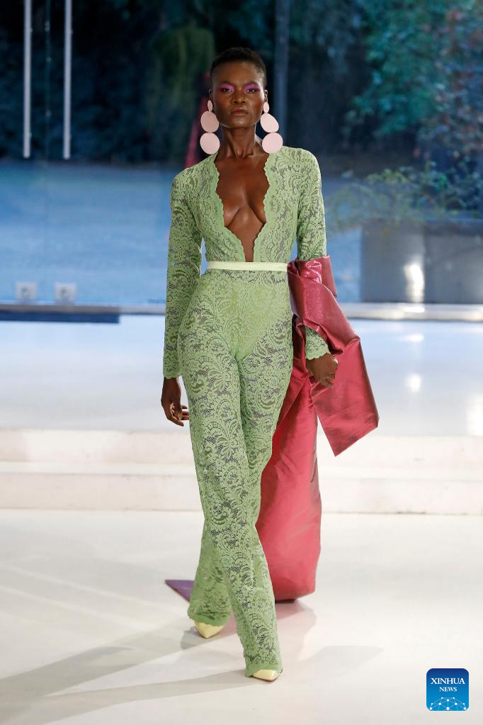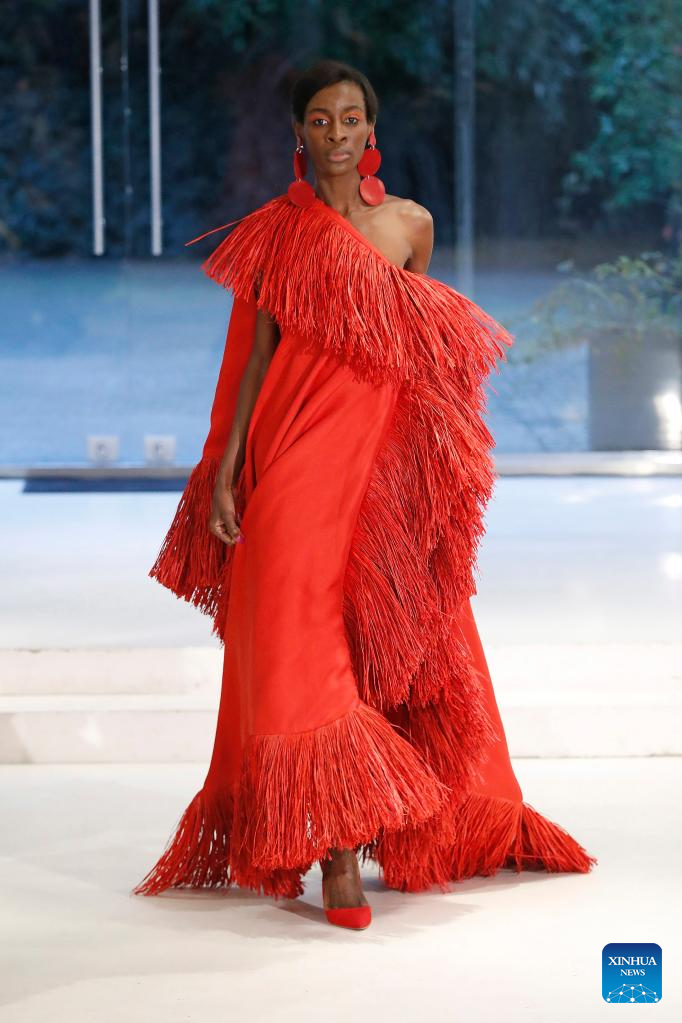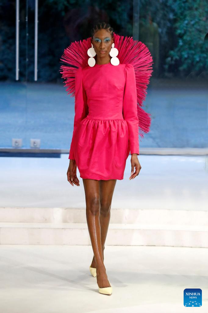 A model presents a creation of Imane Ayissi's Spring/Summer 2022 Haute Couture collections during Paris Fashion Week in Paris, France, Jan. 27, 2022. (Photo by Piero Biasion/Xinhua)