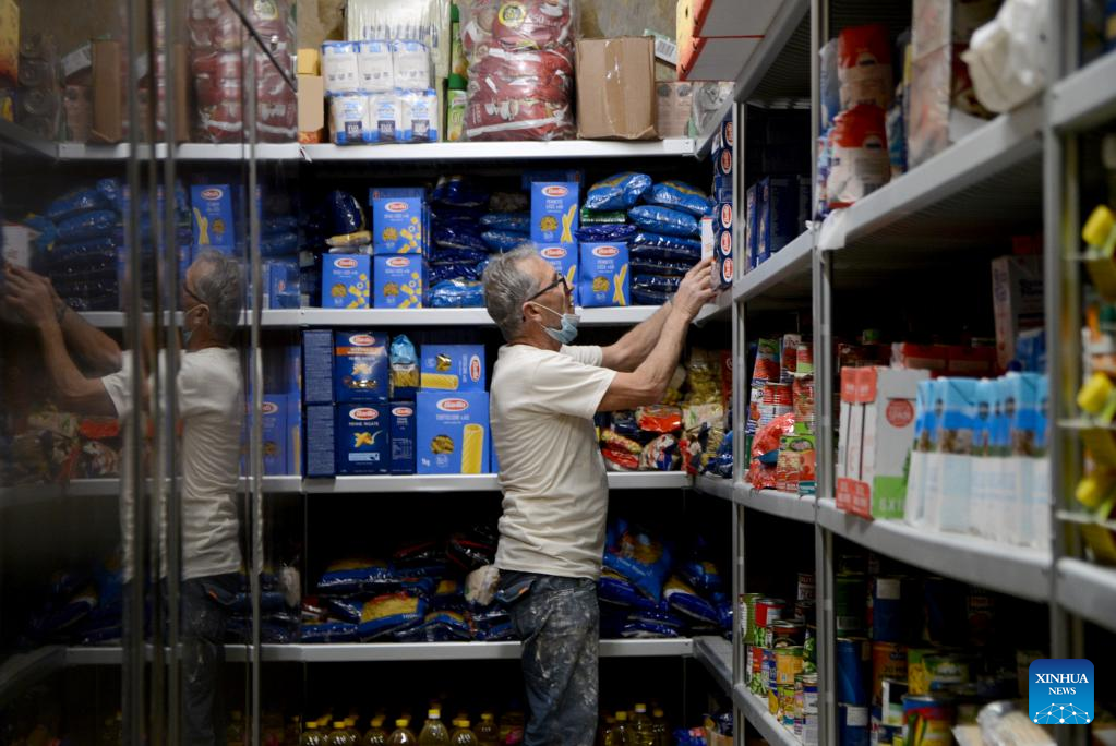 A staff member arranges foodstuff on a shelf in the Soup Kitchen in Valletta, Malta, Jan. 18, 2022. (Photo by Jonathan Borg/Xinhua)