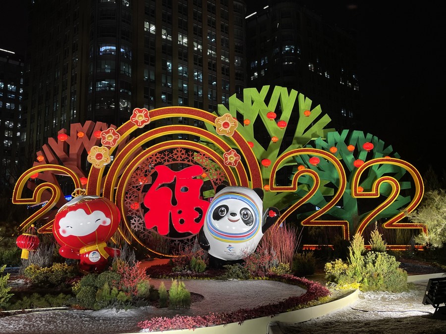 Photo taken on Jan. 20, 2022 shows street decorations for the Beijing 2022 Olympic and Paralympic Winter Games before the upcoming Chinese Lunar New Year in Beijing, capital of China. (Xinhua/Chu Jiayin)