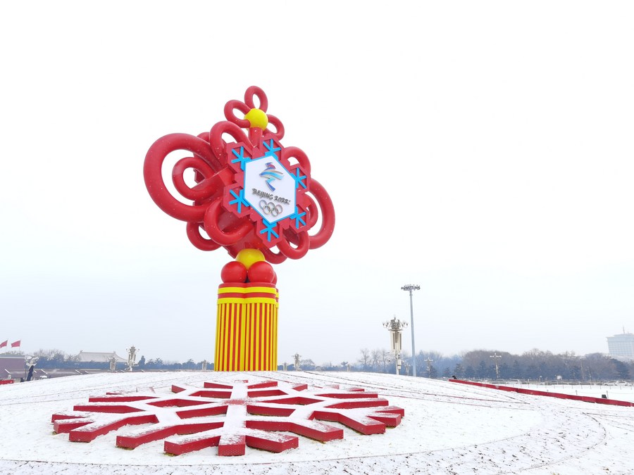 Photo taken on Jan. 20, 2022 shows a giant Chinese knot with emblem of the Beijing 2022 Olympic Winter Games before the upcoming Chinese Lunar New Year on Tian'anmen Square in Beijing, capital of China. (Xinhua/Chen Yehua)