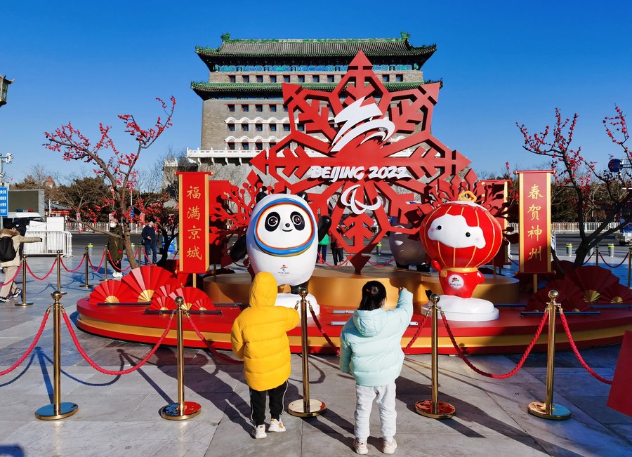 Photo taken on Jan. 16, 2022 shows children looking at street decorations for the Beijing 2022 Olympic and Paralympic Winter Games before the upcoming Chinese Lunar New Year in Beijing, capital of China. (Xinhua/Zhang Chuanqi)