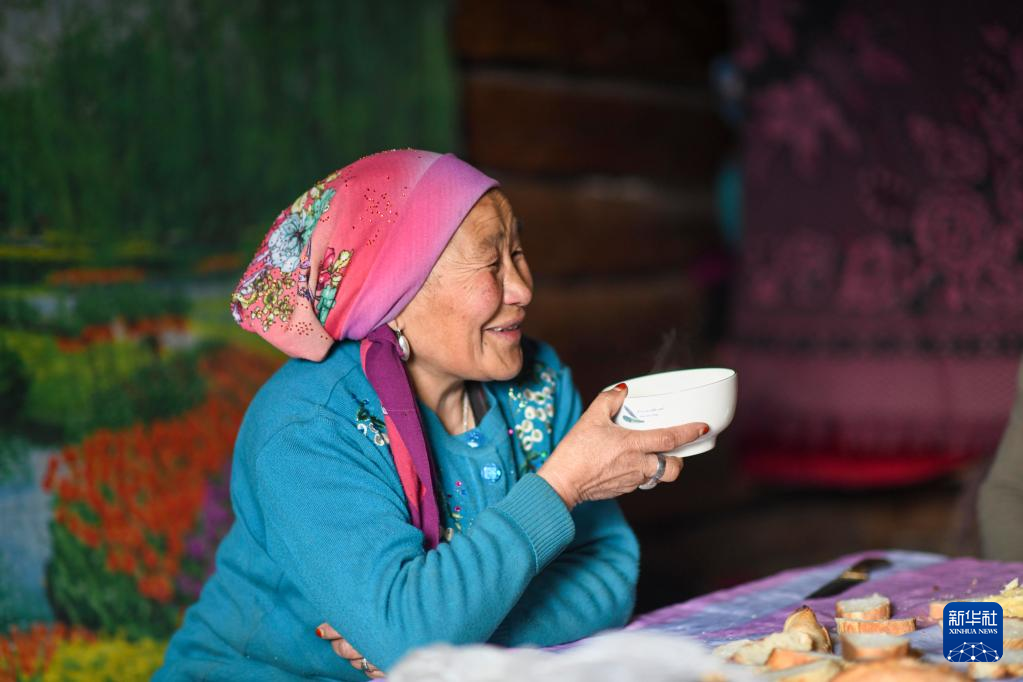 A woman has breakfast at home at the Akyaz Valley in Zhaosu County, northwest China's Xinjiang Uygur Autonomous Region, Jan. 25, 2022. Herdsmen in Xinjiang had lived a nomadic life for centuries. Under a housing project to benefit hundreds of households of local herdsmen, local authorities have initiated construction of supporting facilities to help herdsmen's settlement. It helps herdsmen to start a new life with better medical, educational, cultural and health facilities. (Xinhua/Zhao Ge)