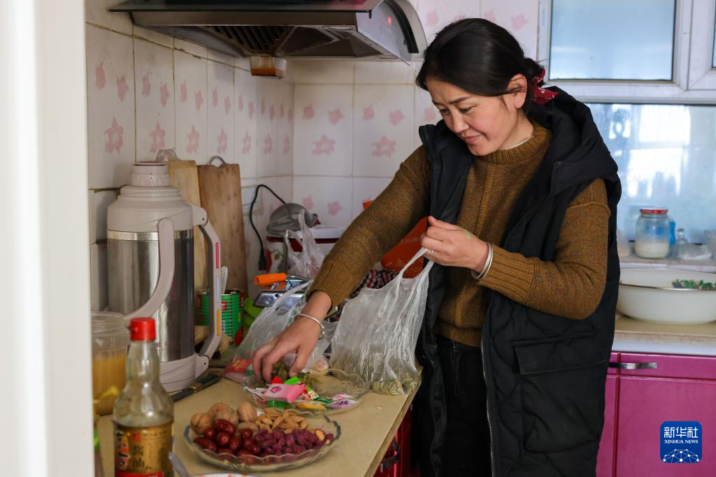 Photo taken on Jan. 27, 2022 shows a woman at her kitchen in Karadala Township of Tekes County, northwest China's Xinjiang Uygur Autonomous Region. Herdsmen in Xinjiang had lived a nomadic life for centuries. Under a housing project to benefit hundreds of households of local herdsmen, local authorities have initiated construction of supporting facilities to help herdsmen's settlement. It helps herdsmen to start a new life with better medical, educational, cultural and health facilities. (Xinhua/Ding Lei)