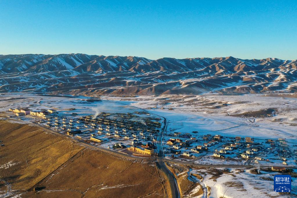 Aerial photo taken on Jan. 27, 2022 shows the view of a village in Karadala Township of Tekes County, northwest China's Xinjiang Uygur Autonomous Region. Herdsmen in Xinjiang had lived a nomadic life for centuries. Under a housing project to benefit hundreds of households of local herdsmen, local authorities have initiated construction of supporting facilities to help herdsmen's settlement. It helps herdsmen to start a new life with better medical, educational, cultural and health facilities. (Xinhua/Ding Lei)