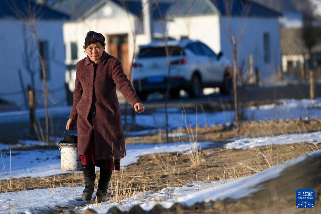 A woman walks back home in Karadala Township of Tekes County, northwest China's Xinjiang Uygur Autonomous Region, Jan. 27, 2022. Herdsmen in Xinjiang had lived a nomadic life for centuries. Under a housing project to benefit hundreds of households of local herdsmen, local authorities have initiated construction of supporting facilities to help herdsmen's settlement. It helps herdsmen to start a new life with better medical, educational, cultural and health facilities. (Xinhua/Ding Lei)