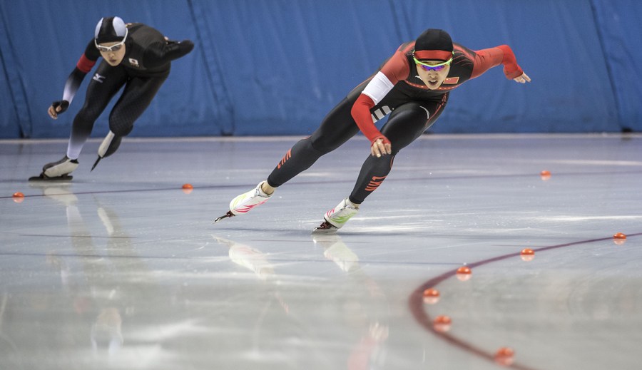 Japan's Arisa Go (L) and China's Yu Jing in action during the women's 500m speed skating at the 2017 Sapporo Asian Winter Games in Obihiro, Japan. (Xinhua/Jiang Wenyao)