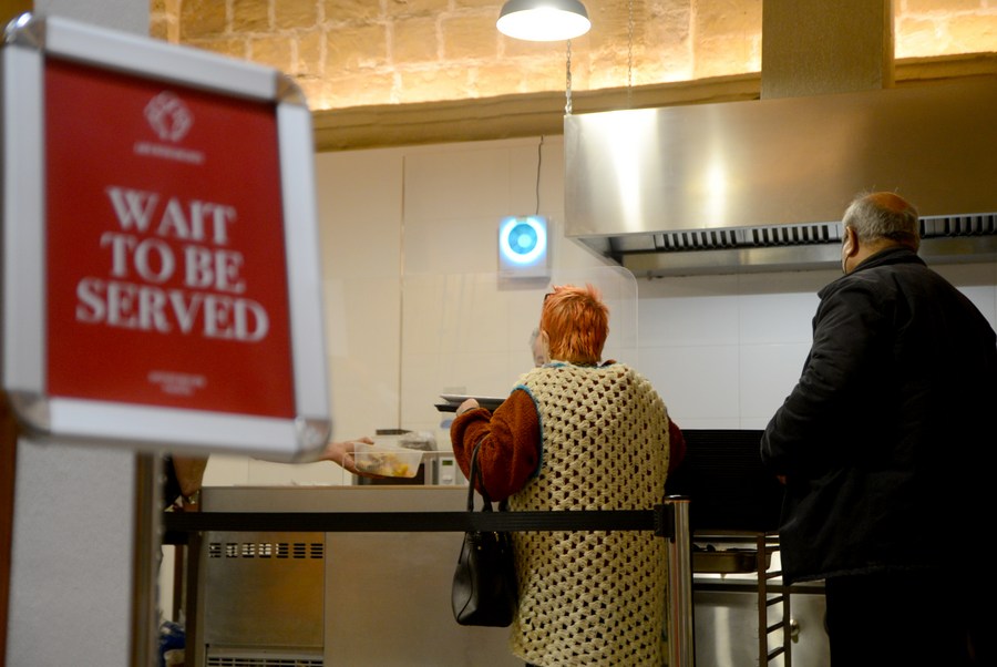 Guests wait to receive food in the Soup Kitchen in Valletta, Malta, Jan. 18, 2022. (Photo by Jonathan Borg/Xinhua) ■