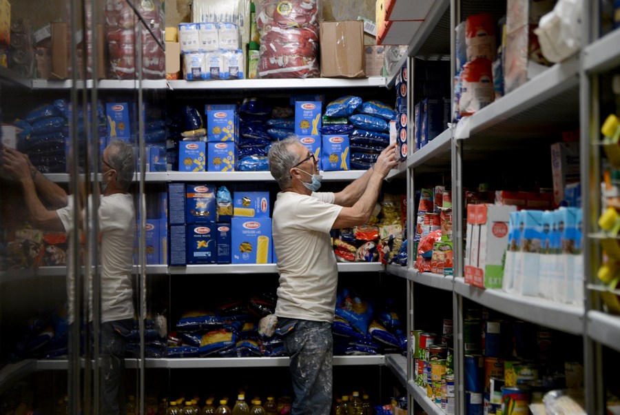 A staff member arranges foodstuff on a shelf in the Soup Kitchen in Valletta, Malta, Jan. 18, 2022. (Photo by Jonathan Borg/Xinhua)