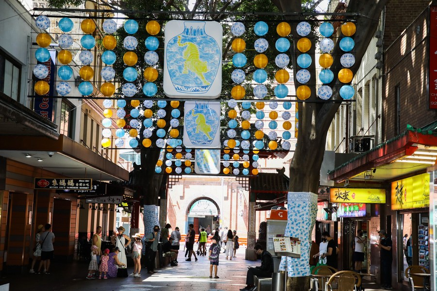 Sydney's Chinatown is decorated with a series of lantern installations overhead designed by Sydney artist Susan Chen on Jan. 29, 2022. (City of Sydney/Xinhua)