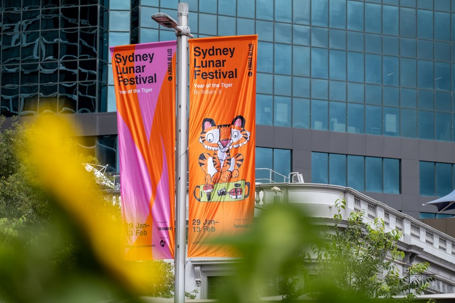Streets in Sydney downtown are decorated with banners featuring the work of local artists themed the Year of the Tiger, on Jan. 29, 2022. (City of Sydney/Xinhua)