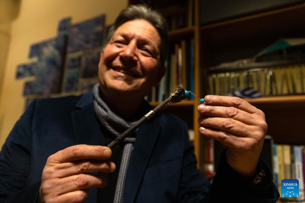 Greek mathematics teacher Nikos Kampanis holds a mechanical pencil in Athens, Greece, on Jan. 22, 2022. Greek mathematics teacher Nikos Kampanis has his own way to inspire his students: by creating a unique mechanical pencil. As a mechanical pencil lover, he now owns a collection of over 5,000 such pencils. (Xinhua/Marios Lolos)