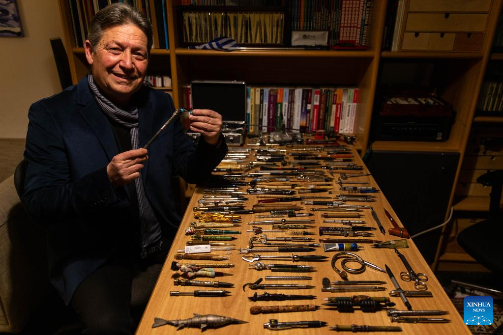Greek mathematics teacher Nikos Kampanis shows his mechanical pencils in Athens, Greece, on Jan. 22, 2022. Greek mathematics teacher Nikos Kampanis has his own way to inspire his students: by creating a unique mechanical pencil. As a mechanical pencil lover, he now owns a collection of over 5,000 such pencils. (Xinhua/Marios Lolos)