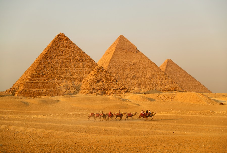 Tourists ride camels to view the Giza Pyramids in Giza, Egypt, on Oct. 21, 2021. (Xinhua/Sui Xiankai)
