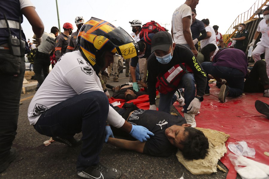 Rescuers work at the site of a traffic accident on the highway nearing Tuxtla Gutierrez, capital of southern Chiapas state, Mexico, Dec. 9, 2021.(Xinhua/Carlos Diaz)