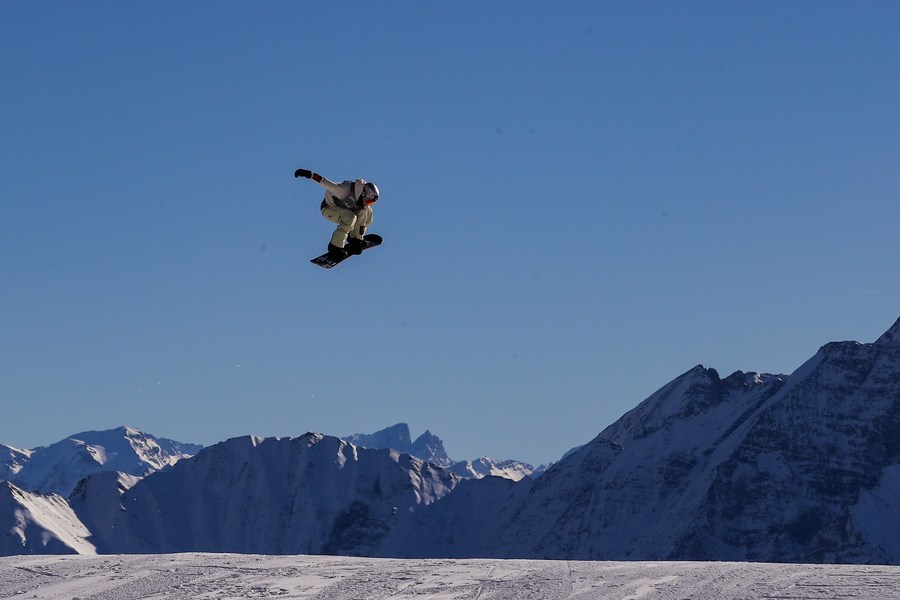 Norway's Marcus Kleveland gets some air during the men's snowboard slopestyle semifinal at the FIS Snowboard World Cup 2022 in Laax, Switzerland on Jan. 14, 2022. (Xinhua/Zhang Cheng)