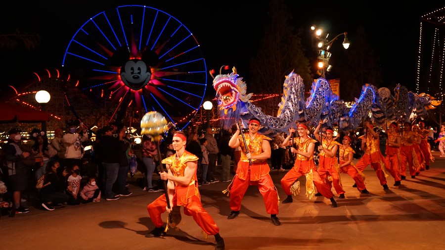 Actors perform a dragon dance during the Lunar New Year celebrations at Disney's California Adventure Park in Anaheim, the United States, on Jan. 21, 2022. (Photo by Zeng Hui/Xinhua)