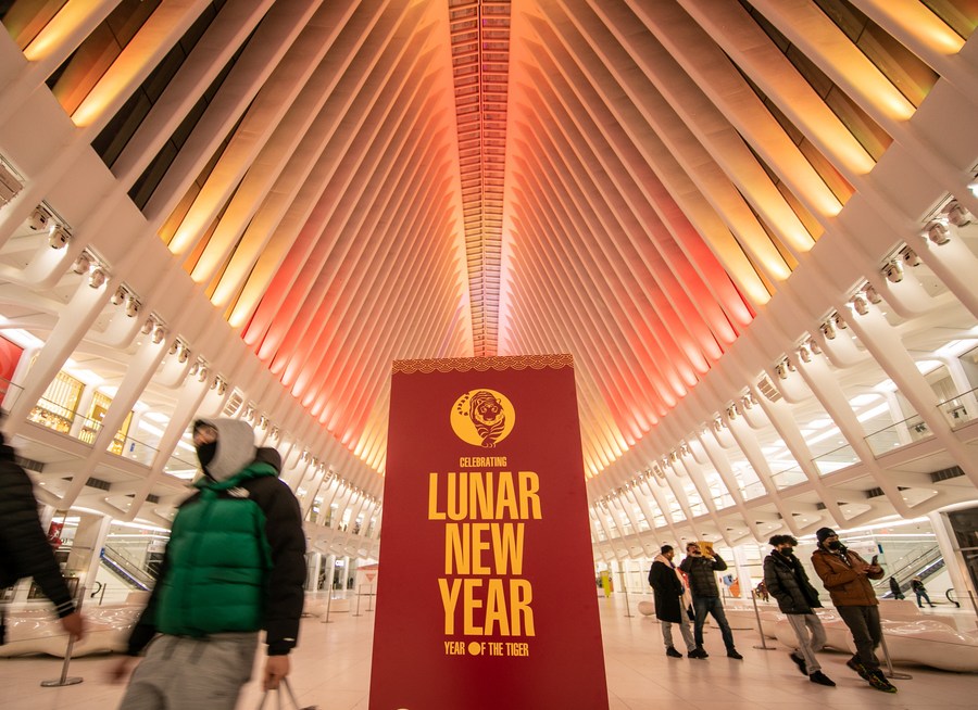 Photo taken on Jan. 30, 2022 shows the Oculus illuminated for the Chinese Lunar New Year, in New York, the United States. (Photo by Winston Zhou/Xinhua)