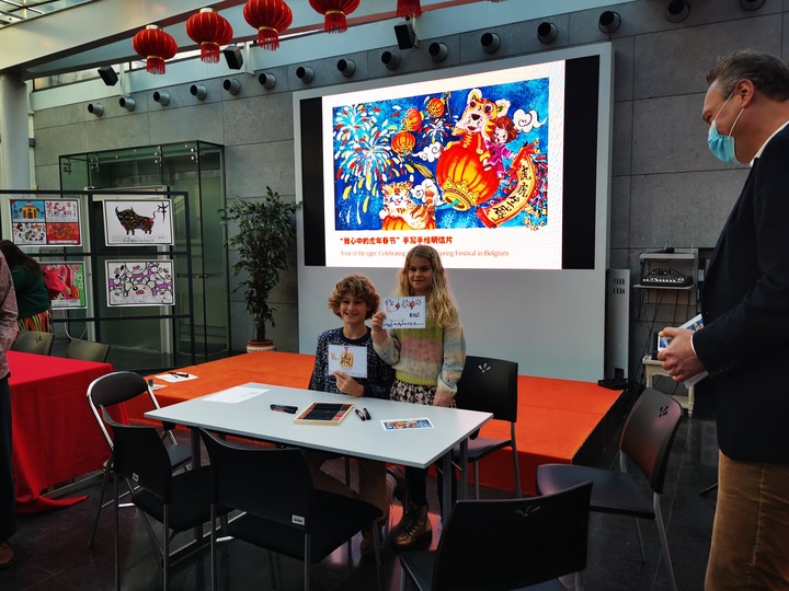 "On the occasion of the Spring Festival of the Year of the Tiger and the Beijing Winter Olympics, the children's hand-painted postcards showcased how Chinese and Belgian children actively participated together in the creation of these works," said Liu Hongge, Cultural Counselor of the Chinese embassy in Belgium at the event.