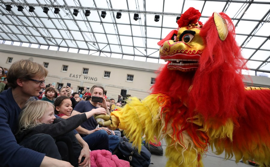 People interacts with artists performing traditional Chinese lion dance during a Chinese Lunar New Year celebration held in National Maritime Museum in London, Britain, Jan. 29, 2022. (Xinhua/Li Ying)