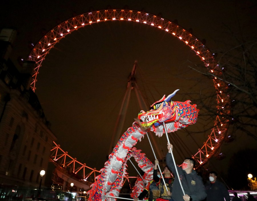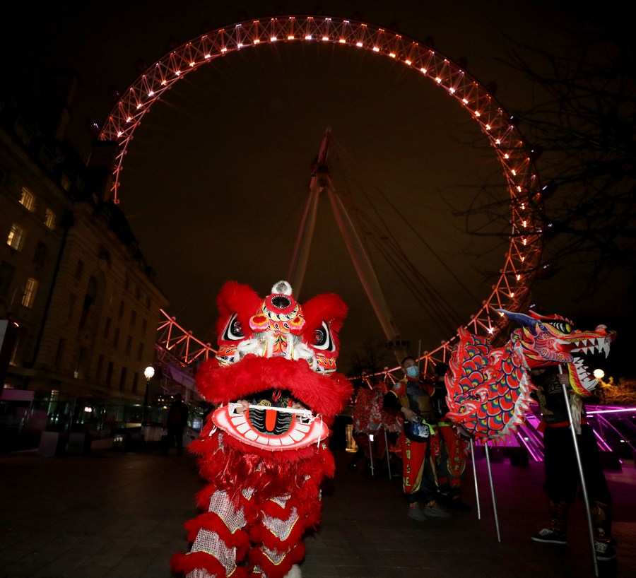 Traditional Chinese dragon dancers perform in front of the London Eye which is lit up in red to celebrate the upcoming Chinese New Year in London, Britain, on Jan. 28, 2022. (Xinhua/Li Ying)