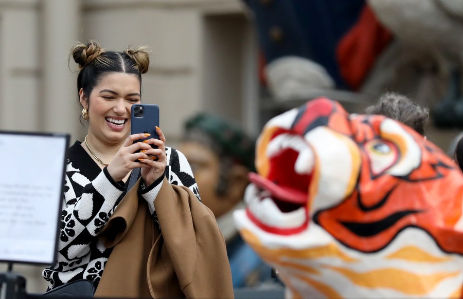 A woman takes photos during a Chinese Lunar New Year celebration held in National Maritime Museum in London, Britain, Jan. 29, 2022. (Xinhua/Li Ying)