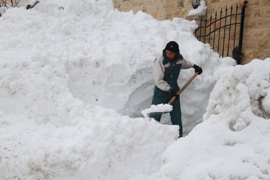 A man clears the way covered with snow after snowstorms in the Bcharre district, northern Lebanon, on Jan. 28, 2022. (Photo by Khaled Habashiti/Xinhua)
