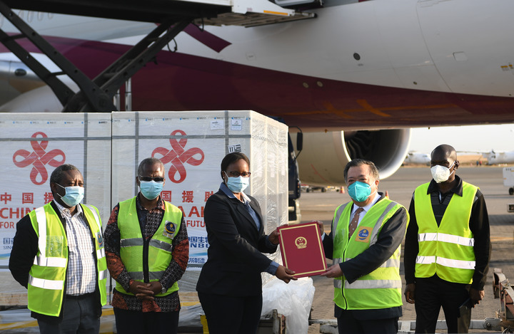 Zhang Yijun (2nd R), minister counselor at the Chinese Embassy in Kenya, and Susan Mochache (C), principal secretary of the Ministry of Health, attend the handover ceremony of China-donated COVID-19 vaccines at an airport in Nairobi, Kenya, Sept. 18, 2021. (Xinhua/Li Yan)