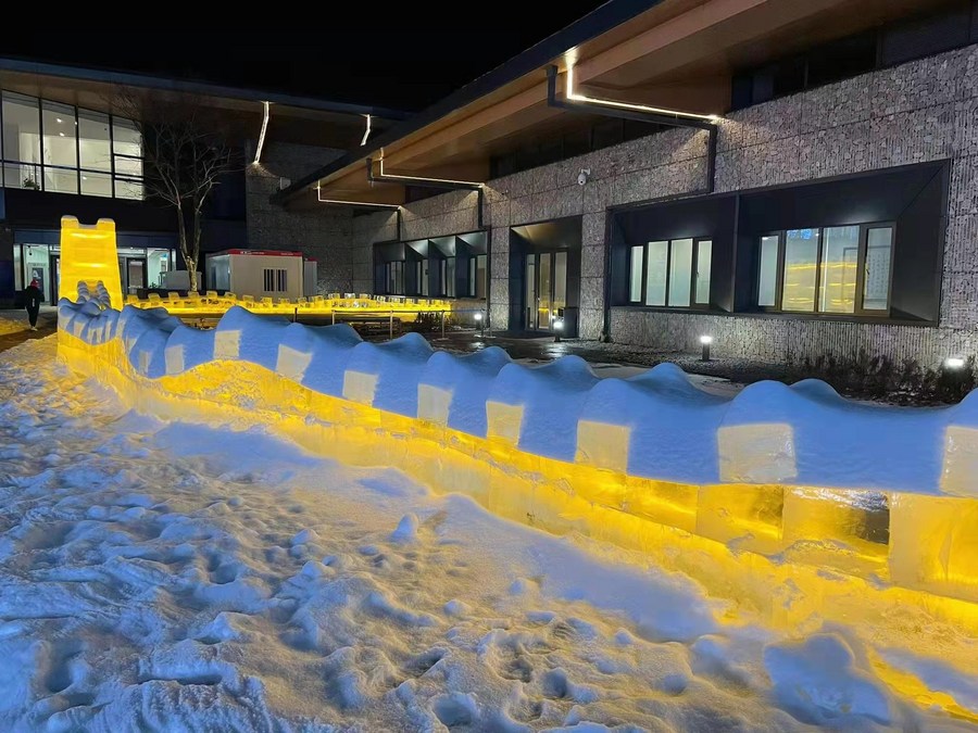 The Olympic villages have also been decorated with Chinese elements and artworks, such as an ice sculpture of the Great Wall in the Yanqing village.