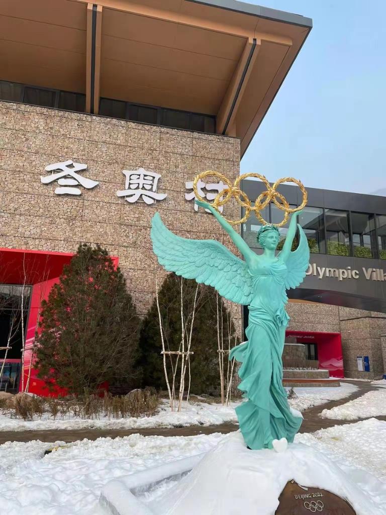 photo, taken on Jan. 26, 2022, shows a statue at the Olympic village in Yanqing zone. (Christof Baer)