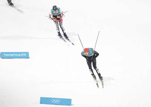 Eric Frenzel (bottom) of Germany competes during individual gundersen NH/10KM event of Nordic Combined at 2018 PyeongChang. (Xinhua/Bai Xuefei)