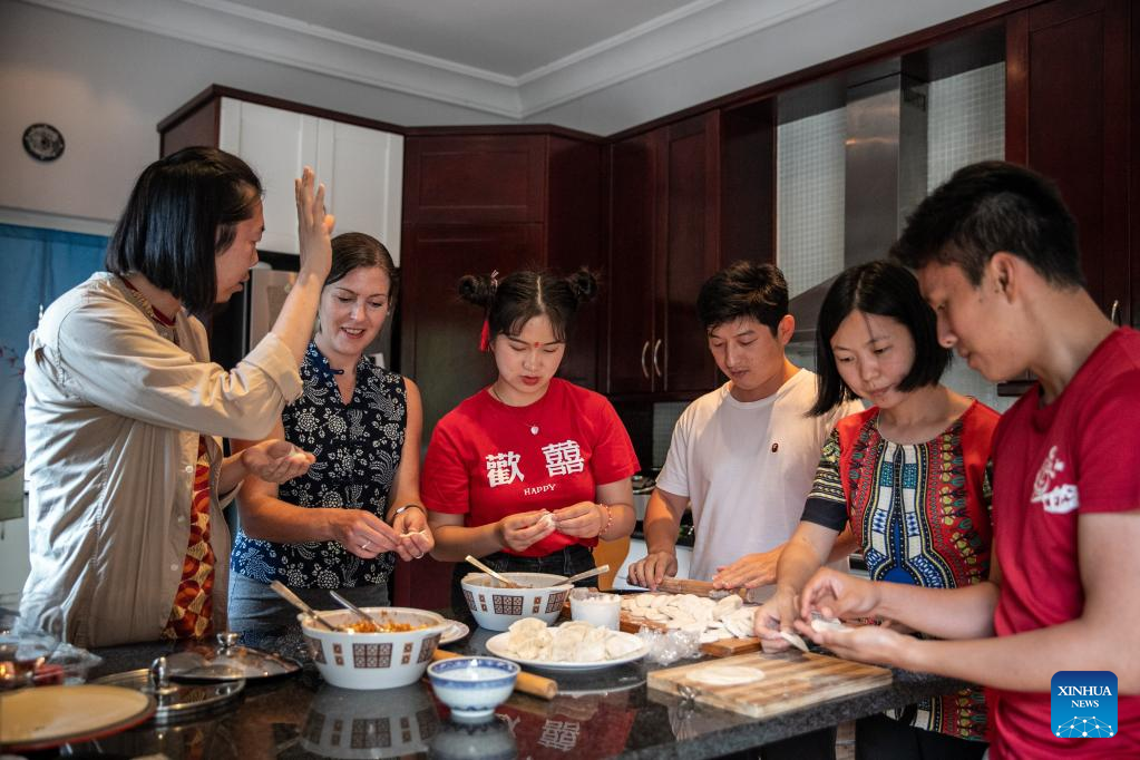 A group of Chinese youth and their South African friend Claire van den Heever (2nd L) make dumplings on the eve of the Chinese Lunar New Year in Cape Town, legislative capital of South Africa, on Jan. 31, 2022. A Chinese youngster Tian Chen and his Chinese fellows on Monday invited their South African friends to celebrate the eve of the Chinese Lunar New Year with them at Tian's home in Chinese ways like making dumplings, eating Chinese food, giving red envelopes and writing couplet. (Xinhua/Lyu Tianran)