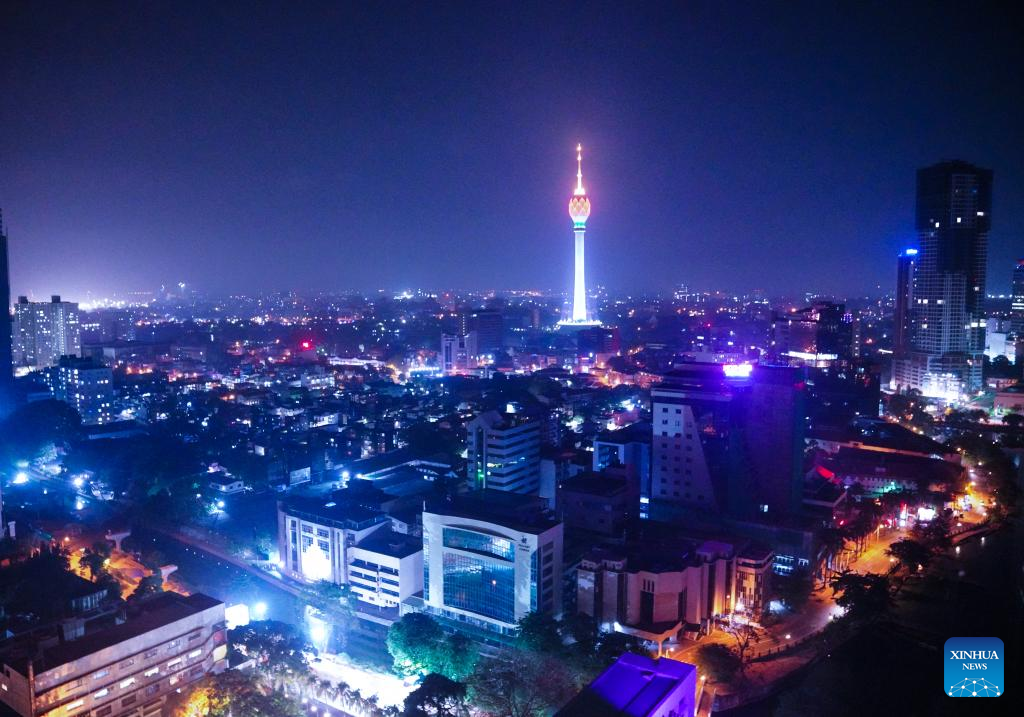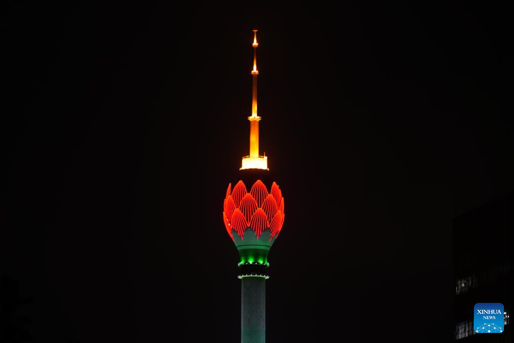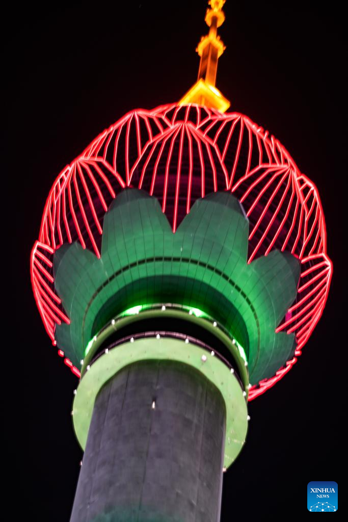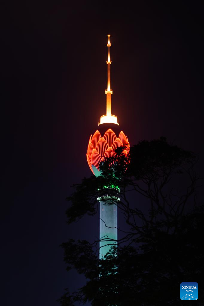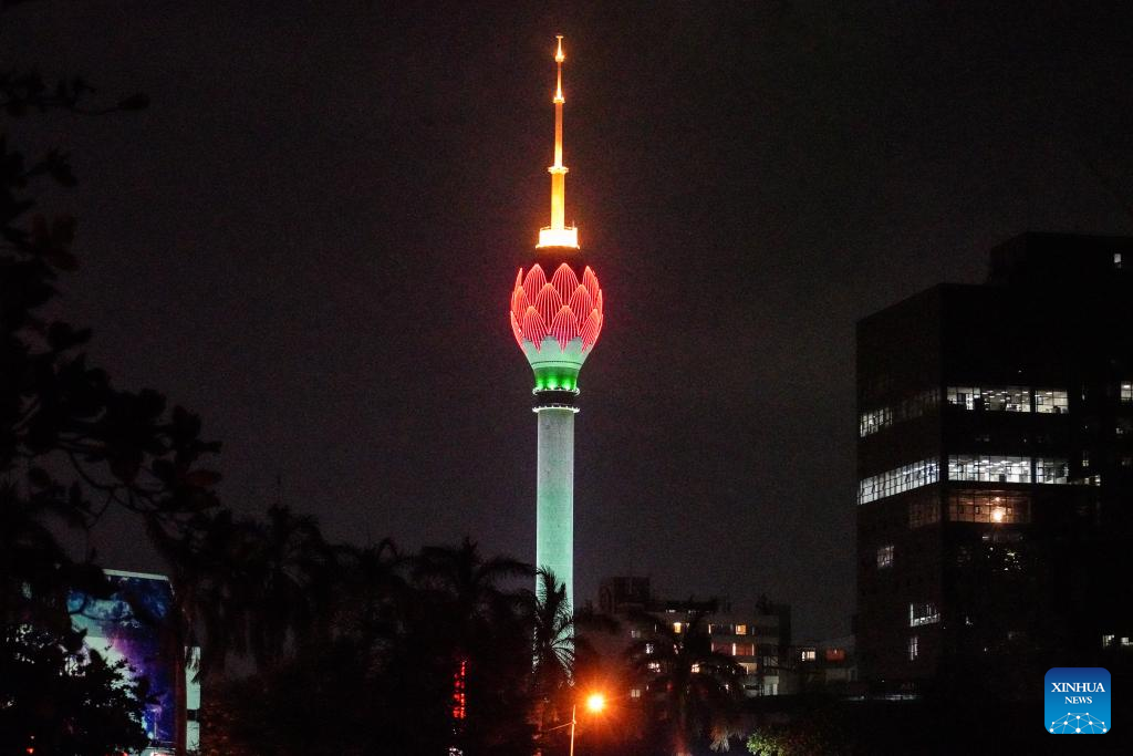 Photo taken on Jan. 31, 2022 shows the lotus tower illuminated in red to celebrate the Chinese Lunar New Year in Colombo, Sri Lanka. (Xinhua/Tang Lu)