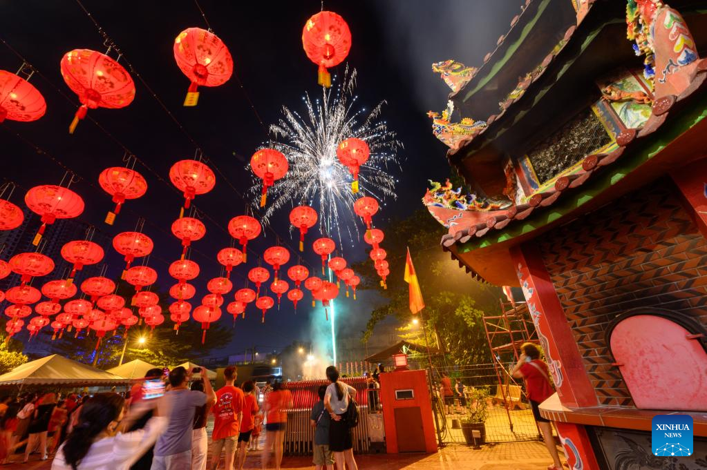People watch fireworks during the celebrations of the Chinese New Year in Batu 11 Cheras near Kuala Lumpur, Malaysia, Jan. 31, 2022. (Photo by Chong Voon Chung/Xinhua)
