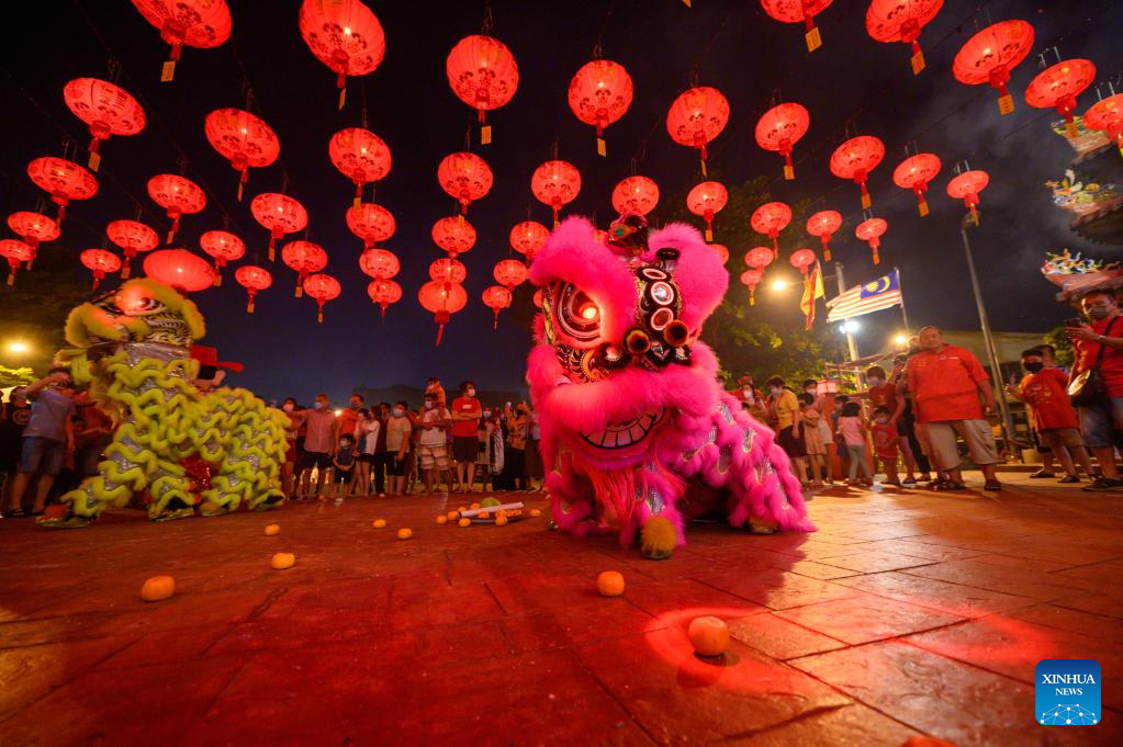 People watch lion dance during the celebrations of the Chinese New Year in Batu 11 Cheras near Kuala Lumpur, Malaysia, Jan. 31, 2022. (Photo by Chong Voon Chung/Xinhua)