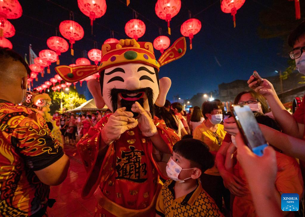 People pose for photos with a "God of Wealth" during the celebrations of the Chinese New Year in Batu 11 Cheras near Kuala Lumpur, Malaysia, Jan. 31, 2022. (Photo by Chong Voon Chung/Xinhua)