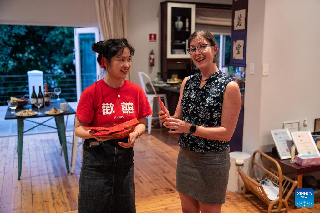 Zeng Aobing (L) gives a red envelope to her South African friend Claire van den Heever to celebrate the eve of the Chinese Lunar New Year in Cape Town, legislative capital of South Africa, on Jan. 31, 2022. A Chinese youngster Tian Chen and his Chinese fellows on Monday invited their South African friends to celebrate the eve of the Chinese Lunar New Year with them at Tian's home in Chinese ways like making dumplings, eating Chinese food, giving red envelopes and writing couplet. (Xinhua/Lyu Tianran)