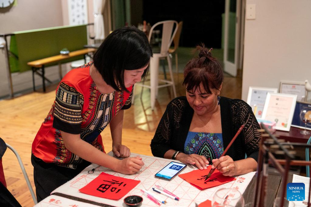 Yan Liling (L) and her South African friend Jean Human practice Chinese calligraphy to celebrate the eve of the Chinese Lunar New Year in Cape Town, legislative capital of South Africa, on Jan. 31, 2022. A Chinese youngster Tian Chen and his Chinese fellows on Monday invited their South African friends to celebrate the eve of the Chinese Lunar New Year with them at Tian's home in Chinese ways like making dumplings, eating Chinese food, giving red envelopes and writing couplet. (Xinhua/Lyu Tianran)