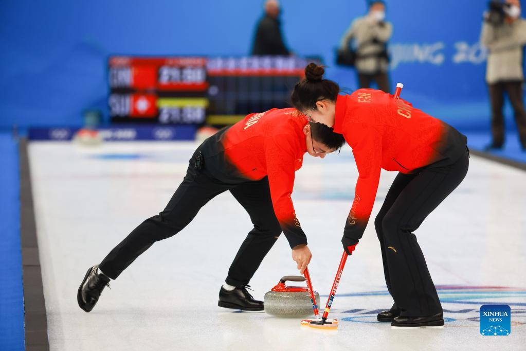 China's Fan Suyuan (L) and Ling Zhi are seen during the curling mixed doubles round robin session of the Beijing 2022 Winter Olympic Games between China and Switzerland at the National Aquatics center in Beijing, China, Feb. 2, 2022. (Xinhua/Liu Xu)