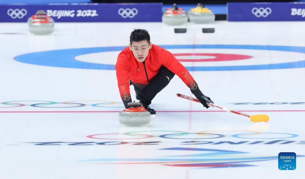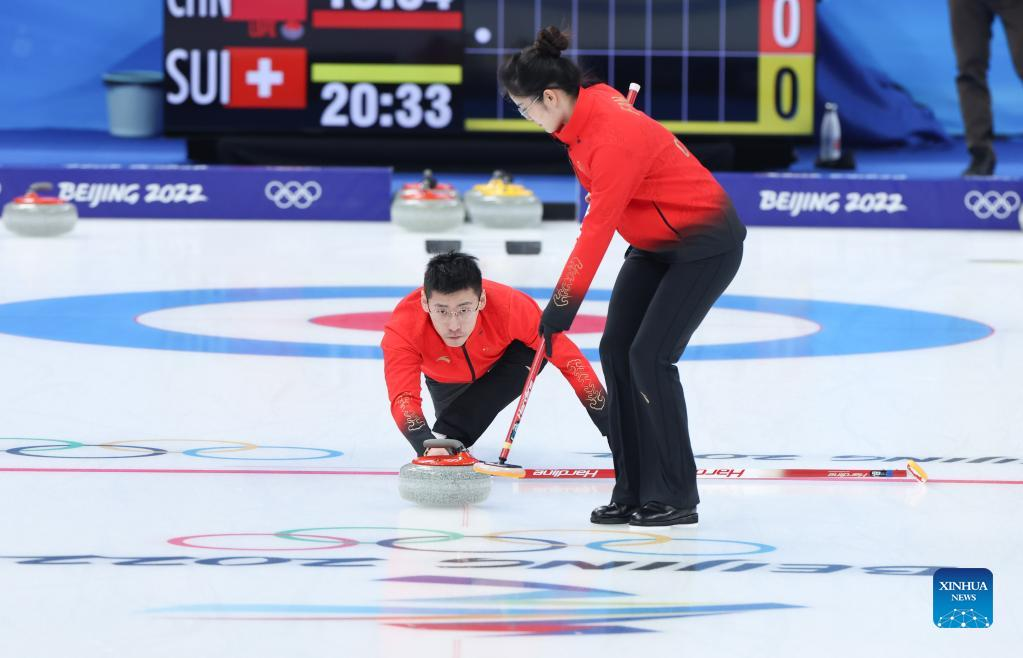 China's Ling Zhi competes during the curling mixed doubles round robin session of the Beijing 2022 Winter Olympic Games between China and Switzerland at the National Aquatics center in Beijing, China, Feb. 2, 2022. (Xinhua/Cheng Tingting)