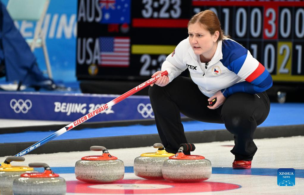 Zuzana Paulova of Czech Republic comepetes during the curling mixed doubles round robin event of the Beijing 2022 Winter Olympic Games between Norway and Czech Republic at National Aquatics Centre in Beijing, China, Feb. 2, 2022. (Xinhua/Wang Fei)