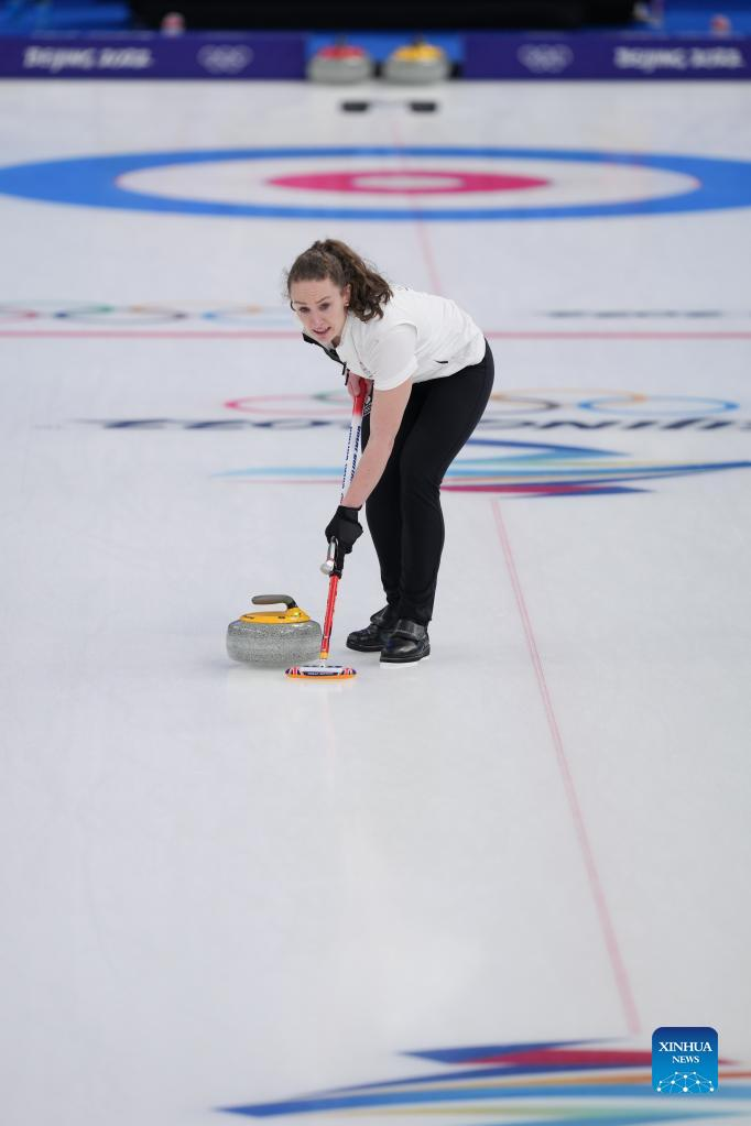 Jennifer Dodds of Great Britain competes during the curling mixed doubles round robin event of the Beijing 2022 Winter Olympic Games between Great Britain and Sweden at National Aquatics Centre in Beijing, China, Feb. 2, 2022. (Xinhua/Zhou Mi)