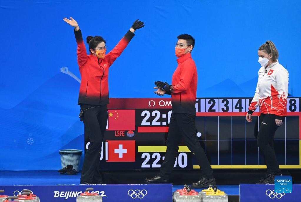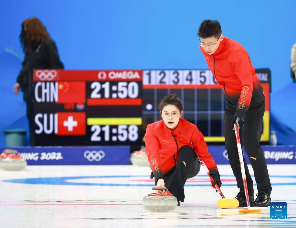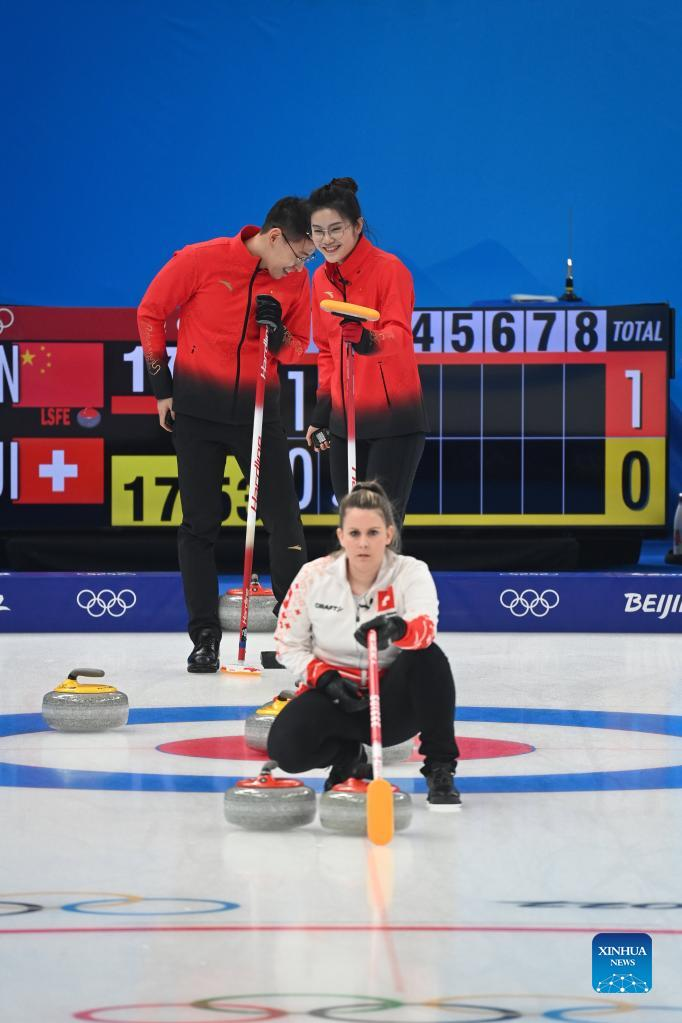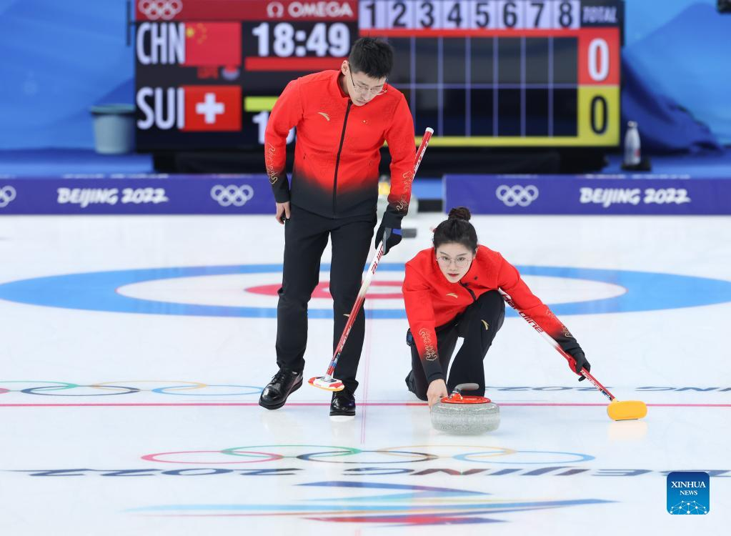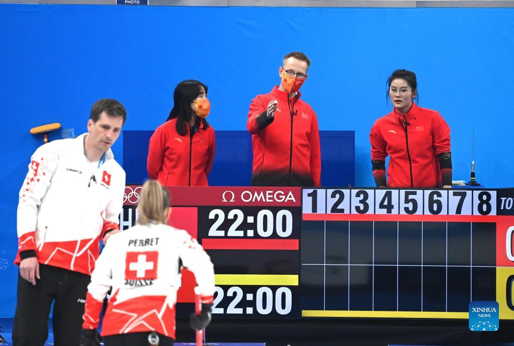 Fan Suyuan (1st R) of China watches athletes of Switzerland having training before the curling mixed doubles round robin event of the Beijing 2022 Winter Olympic Games between China and Switzerland at National Aquatics Centre in Beijing, China, Feb. 2, 2022. (Xinhua/Huang Xiaobang)